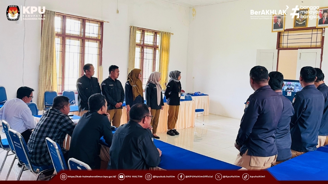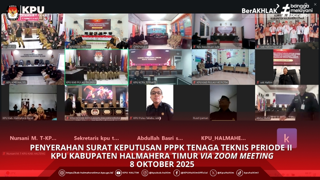 Komisi Pemilihan Umum Kabupaten Halmahera Timur mengikuti kegiatan Penyerahan Surat Keputusan (SK) Pegawai Pemerintah dengan Perjanjian Kerja (PPPK) Tenaga Teknis Periode II yang dilaksanakan secara virtual melalui Zoom Meeting, pada Rabu, 8 Oktober 2025.