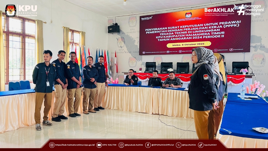 Pelaksanaan kegiatan berlangsung di Aula Kantor KPU Kabupaten Halmahera Timur dan diikuti secara khidmat oleh para pegawai penerima SK. Sebanyak 10 orang PPPK Tenaga Teknis di lingkungan KPU Kabupaten Halmahera Timur menerima SK dalam kegiatan ini, yaitu: