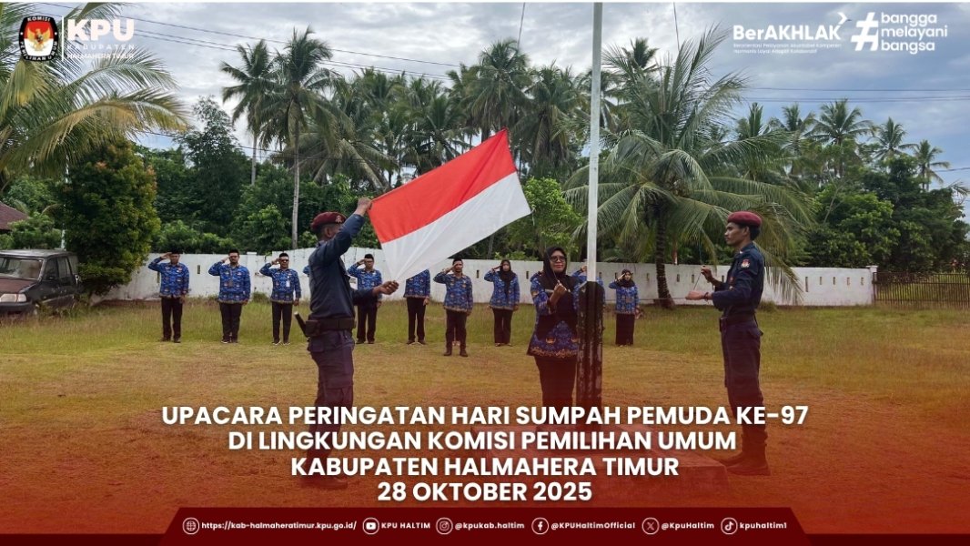 Maba, 28 Oktober 2025 – Komisi Pemilihan Umum Kabupaten Halmahera Timur menggelar Upacara Peringatan Hari Sumpah Pemuda Tahun 2025 dengan tema “Pemuda Pemudi Bergerak, Indonesia Bersatu”, bertempat di halaman Kantor KPU Kabupaten Halmahera Timur, Jalan Atib Marala, Desa Soagimalaha, Kecamatan Kota Maba, pada Senin (28/10/2025) pukul 08.00 WIT.
