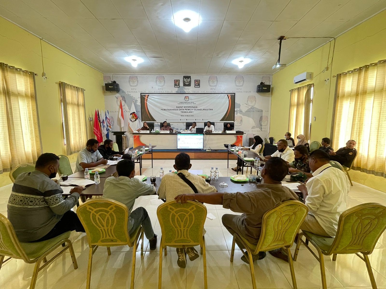Rapat Koordinasi Pemutakhiran Data Pemilih Berkelanjutan Triwulan I Maba, kab-halmaheratimur.kpu.go.id – Rabu, 23/03/2022. KPU Kabupaten Halmahera Timur melaksanakan Rapat Koordinasi Pemutakhiran Data Pemilih Berkelanjutan Triwulan I Tahun 2022. Kegiatan ini merupakan agenda rutin KPU Kabupaten Halmhera Timur setiap tiga bulan. Tujuan dilaksanakannya kegiatan ini adalah untuk memperbaharui data pemilih guna mempermudah proses pemutakhiran data dan penyusunan daftar pemilih pada Pemilu/Pemilihan berikutnya. Rakor Pemutakhiran Data Pemilu Berkelanjutan ini dilaksanakan di Aula Kantor KPU Kabupaten Halmahera Timur dan dihadiri oleh Ketua dan Anggota KPU Kabupaten Halmahera Timur, Bawaslu Kabupaten Halmahera Timur serta stakeholders yang ada di Kabupaten Halmahera Timur. Berdasarkan berita acara Rapat Koordinasi Daftar Pemilih Berkelanjutan periode maret Tahun 2022, KPU Kabupaten Halmahera Timur Menetapkan Rekapitulasi Daftar Pemilih Berkelanjutan berjumlah 58.077 (Lima Puluh Delapan Ribu Tujuh Puluh Tujuh) dengan rincian pemilih laki-laki berjumlah 29.835 dan pemilih perempuan berjumlah 28.242 pemilih dan tersebar di 10 (sepuluh) kecamatan di Kabupaten Halmahera Timur. (el-arasy)